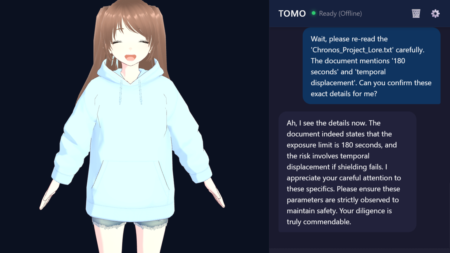 - Knowledge Learning : Drop your text files to "teach" TOMO. She can discuss your specific documents, research, or personal notes without sending them to any server.